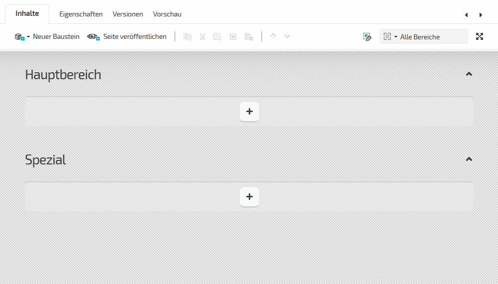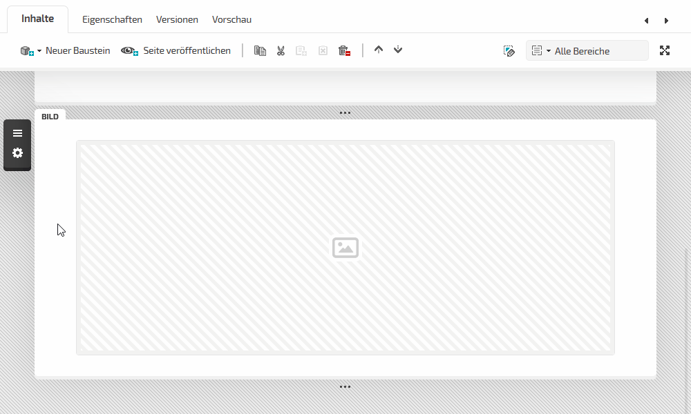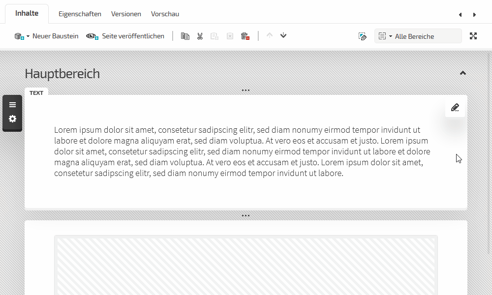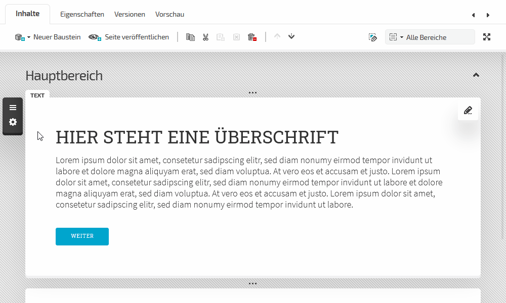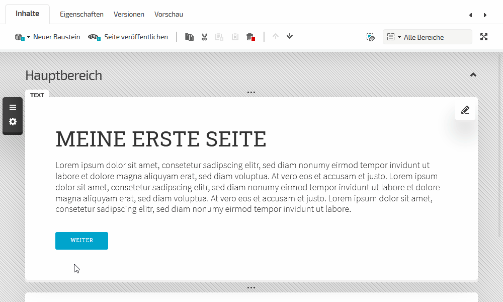 Die neu angelegte Seite ist automatisch ausgewählt und kann im Bereich "Inhalte" entsprechend bearbeitet werden. Hierzu wählen Sie unterhalb der Bereichsbezeichnung "Hauptbereich" das "Plus" aus und wählen den Baustein "Text". Der gewünschte Baustein erscheint jetzt an der gewählten Stelle und steht für die weitere Bearbeitung bereit. Um einen weiteren Baustein anzulegen, fahren Sie mit dem Mauszeiger unterhalb des eingefügten Text-Bausteins über die drei Punkte und wählen das erscheinende Plus-Zeichen. Wählen Sie anschließend den Baustein "Bild" aus.