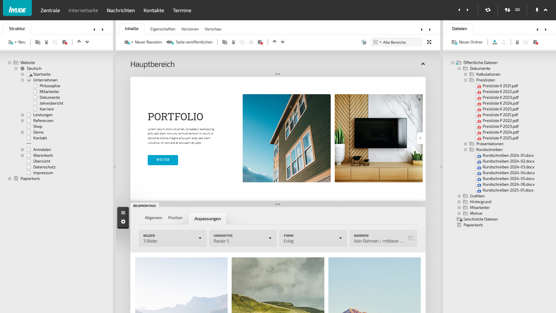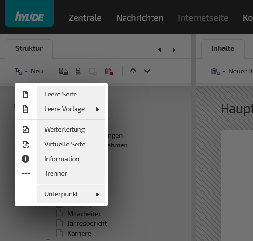 Eine zentrale Anwendung in hylide© ist die Anwendung "Internetseite". Hier können Sie die Inhalte Ihrer Website erstellen, verwalten und organisieren. Die Anwendung ist dabei in folgende Bereiche aufgeteilt: